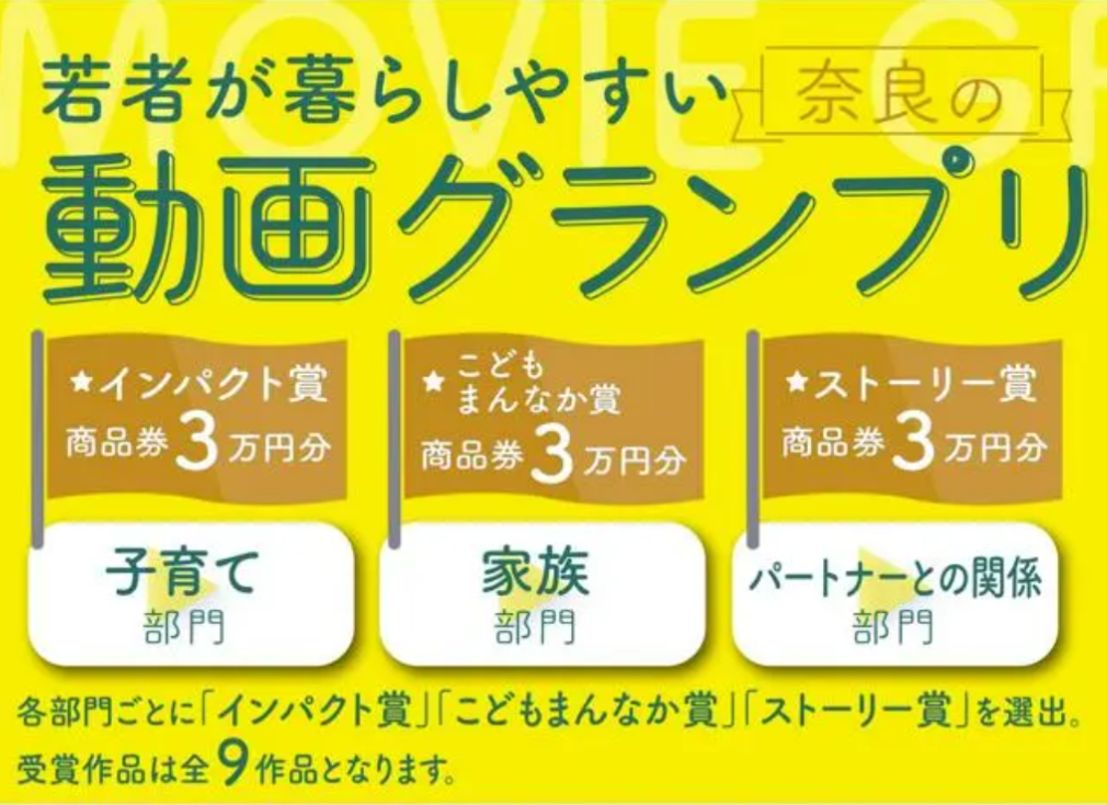 「若者が暮らしやすい奈良の動画グランプリ」は、未婚化や晩婚化が進むなかで、パートナーを得ることや育児についてポジティブなイメージを持ってほしいと、コンテスト形式でPR動画を公募している。県内在住・在勤でなくても応募可能。3分以内の映像で、実写やCG、アニメなど表現の形式は問わない。
